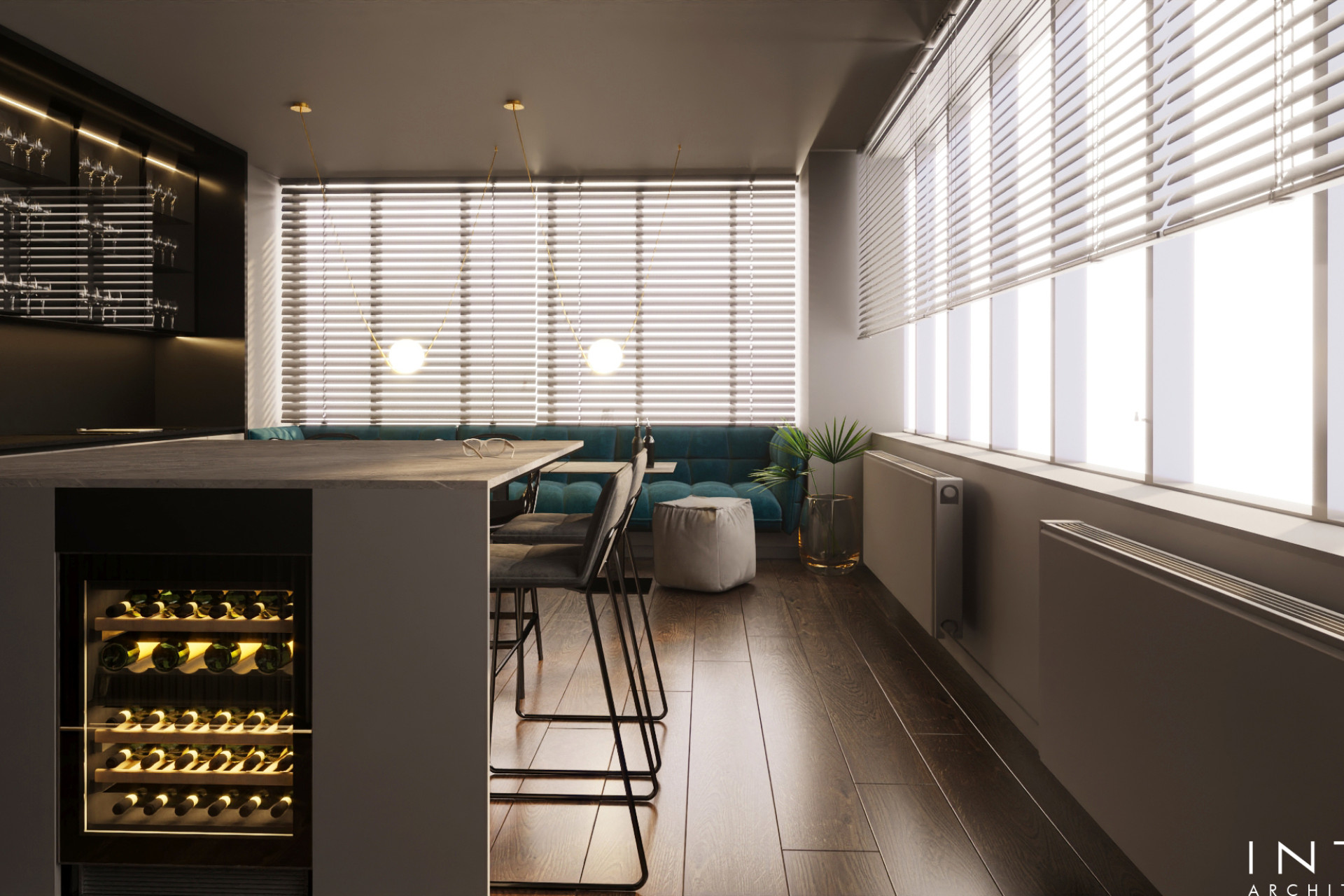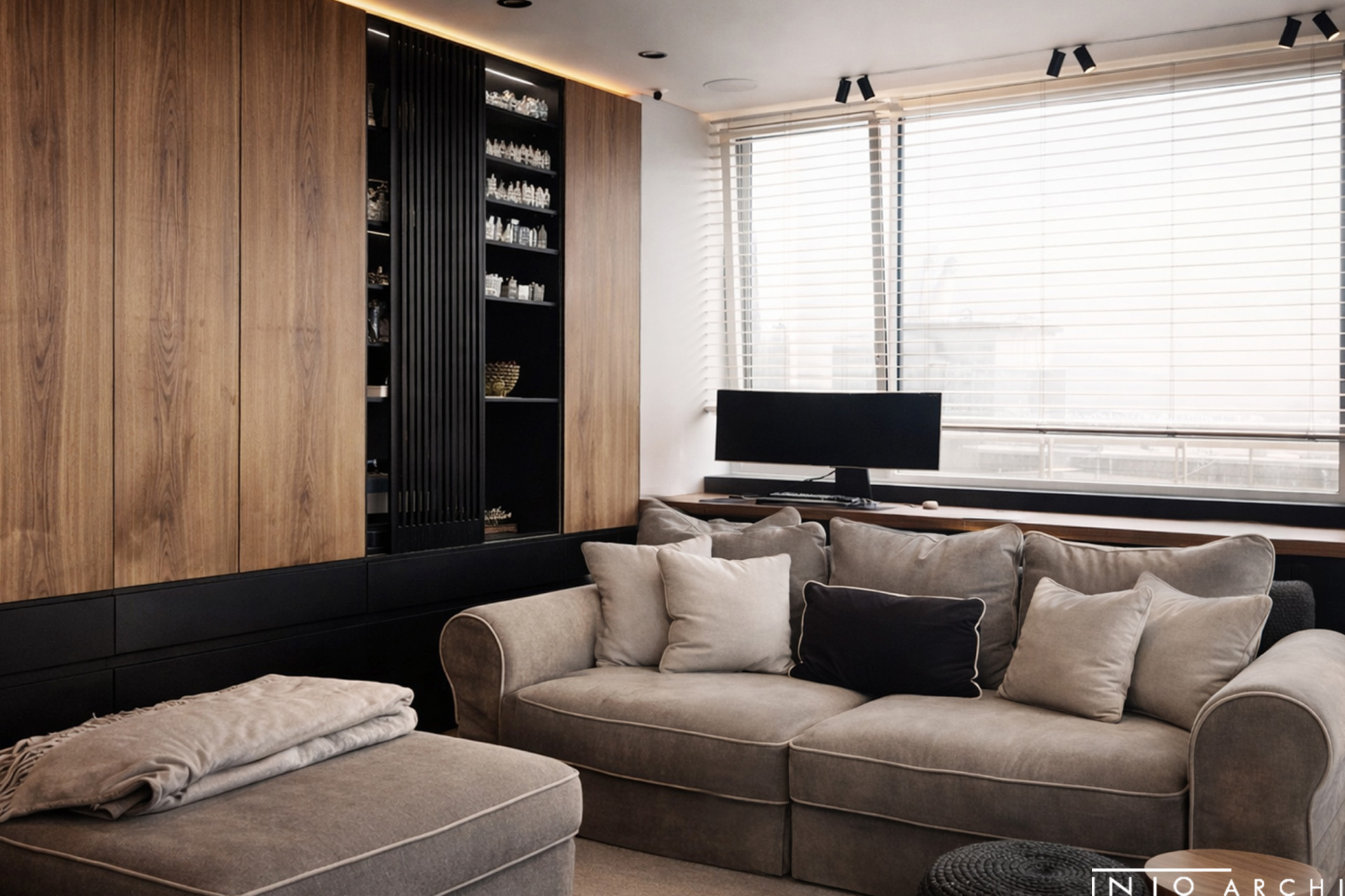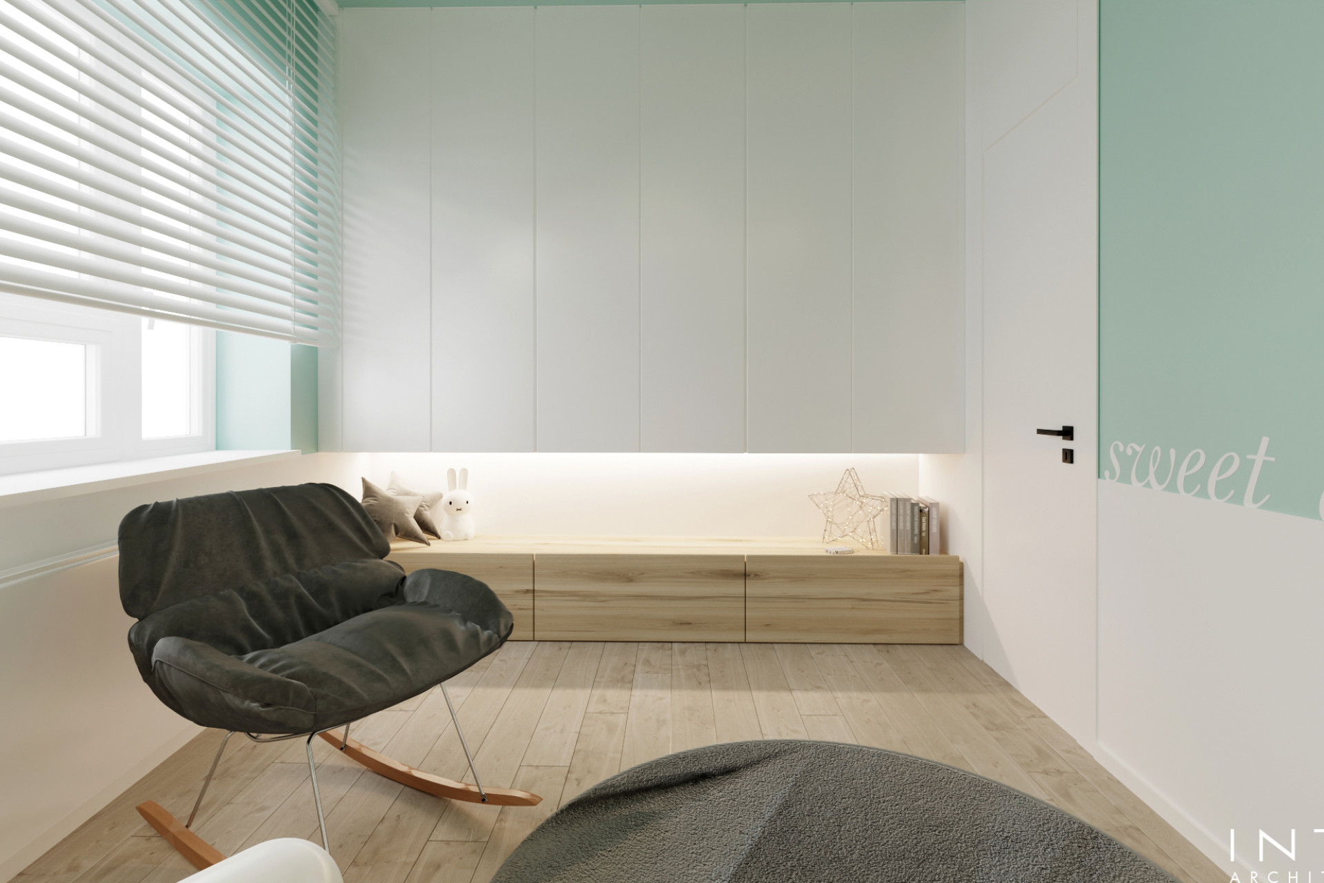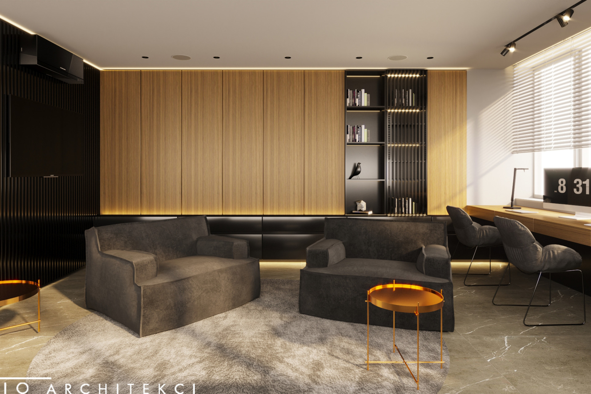 Projekt uwzględnia również zaawansowany system nagłośnienia, dyskretnie wkomponowany w zabudowę oraz układ wnętrza, tworząc spójną przestrzeń łączącą estetykę z wysoką jakością odbioru dźwięku.