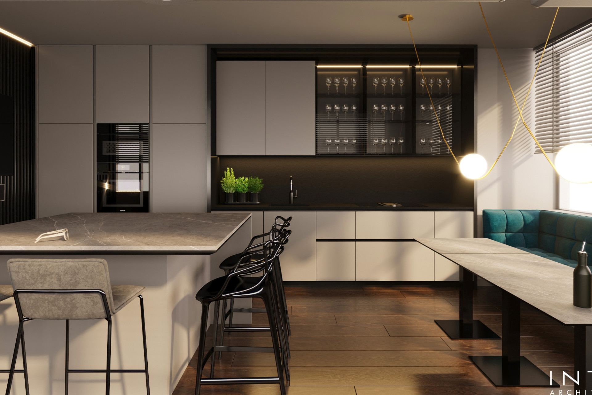 Otwarta przestrzeń łącząca salon, kuchnię i jadalnię została zaprojektowana jako elegancka kompozycja oparta na prostych formach oraz szlachetnych materiałach. Kluczowym elementem projektu są indywidualnie projektowane zabudowy meblowe na wymiar.