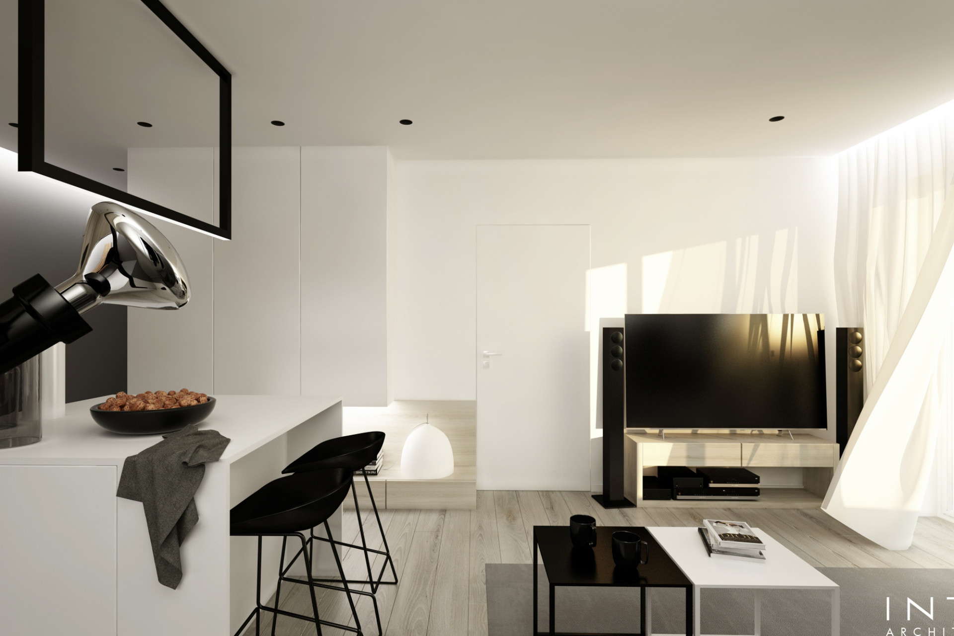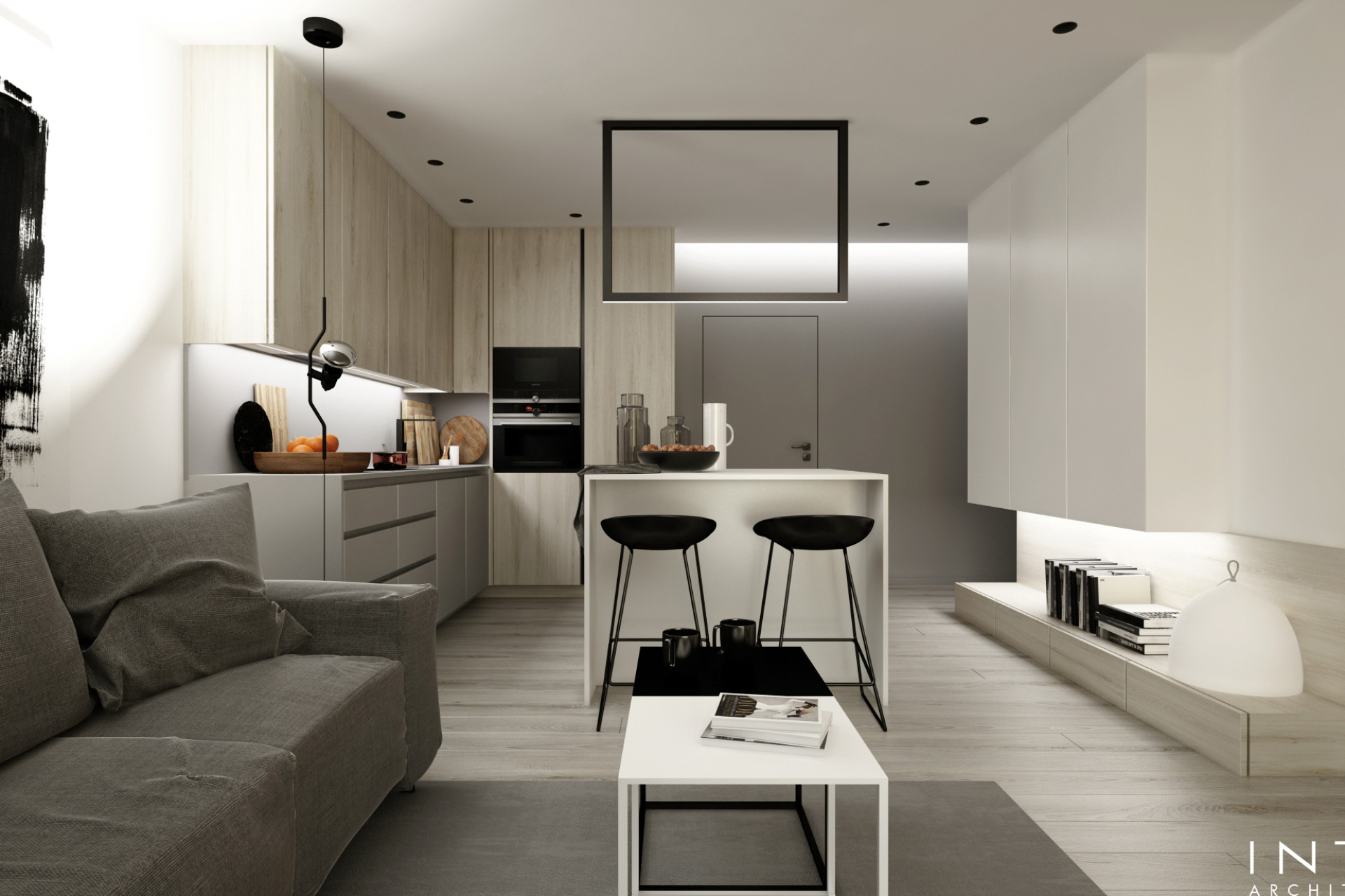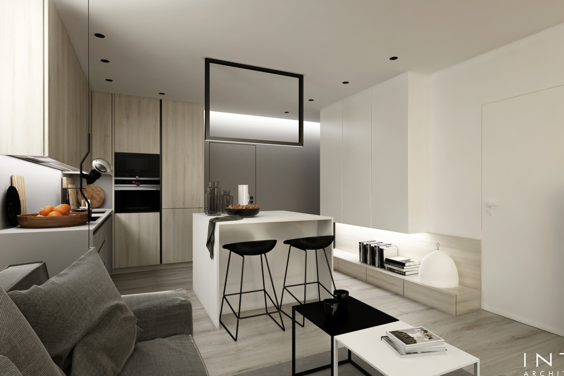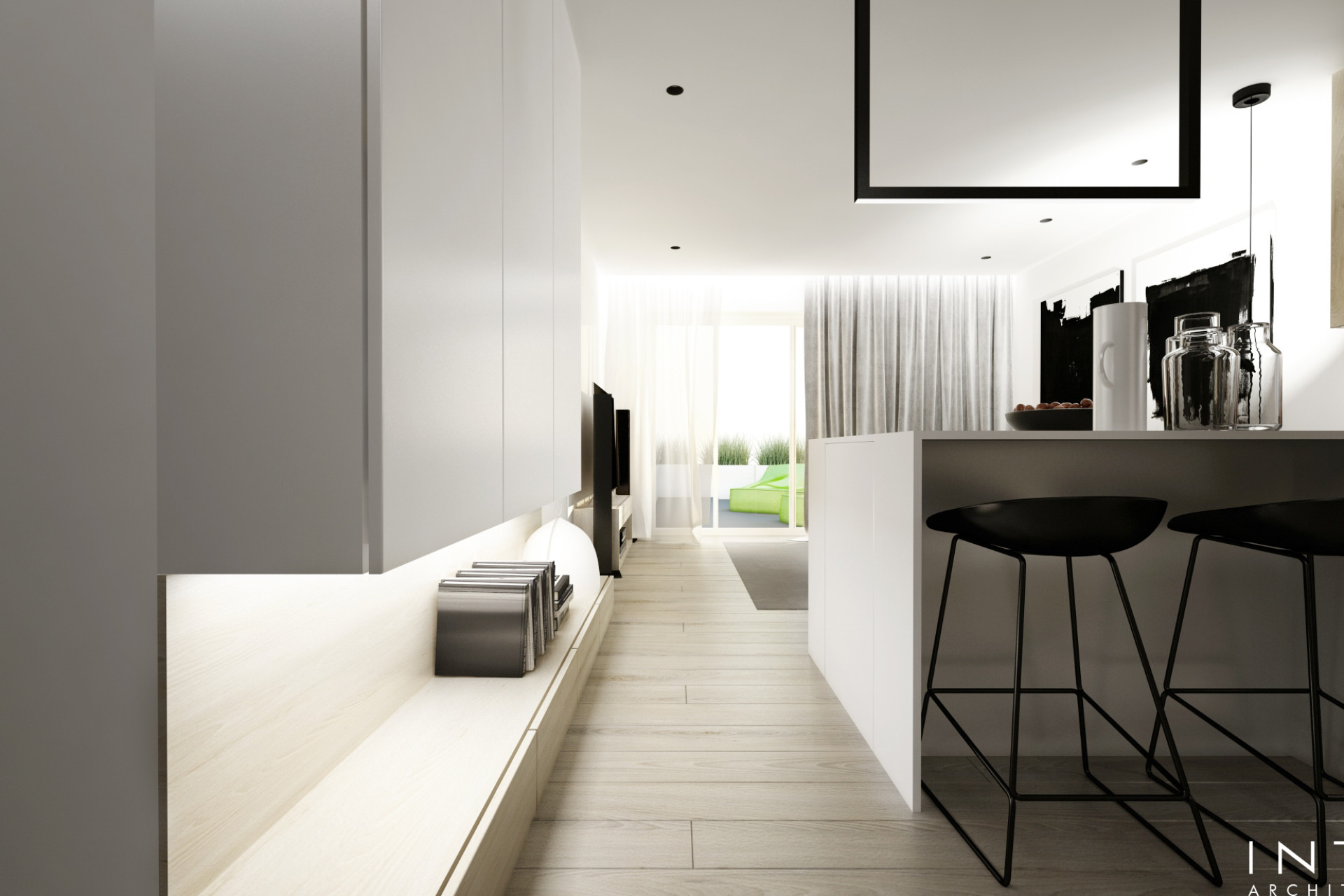 Wnętrze utrzymane jest w stonowanej palecie barw, bazującej na zestawieniu bieli, naturalnego drewna oraz czarnych detali. Geometryczne akcenty i konsekwentnie prowadzone linie zabudów podkreślają architektoniczny charakter projektu.
