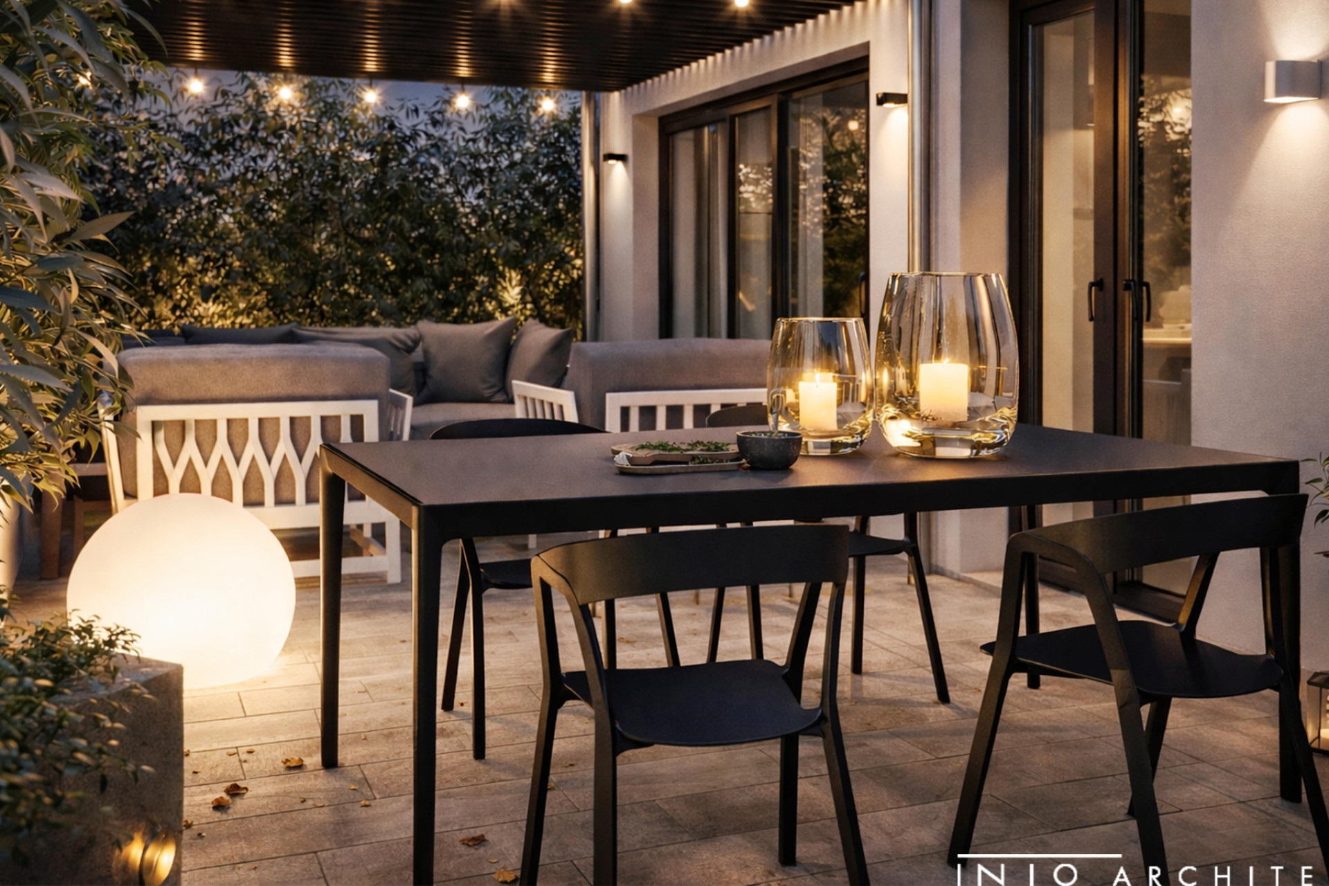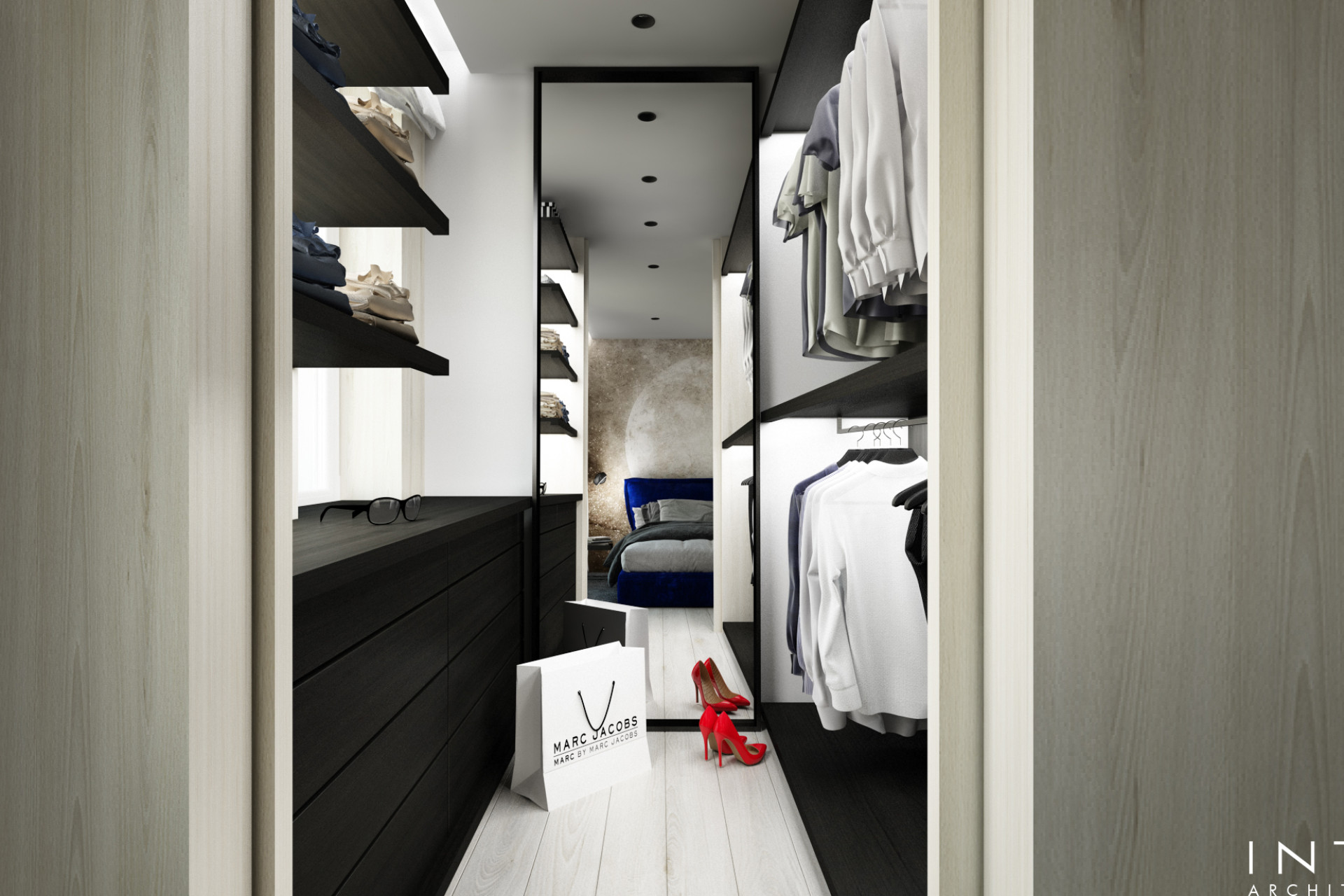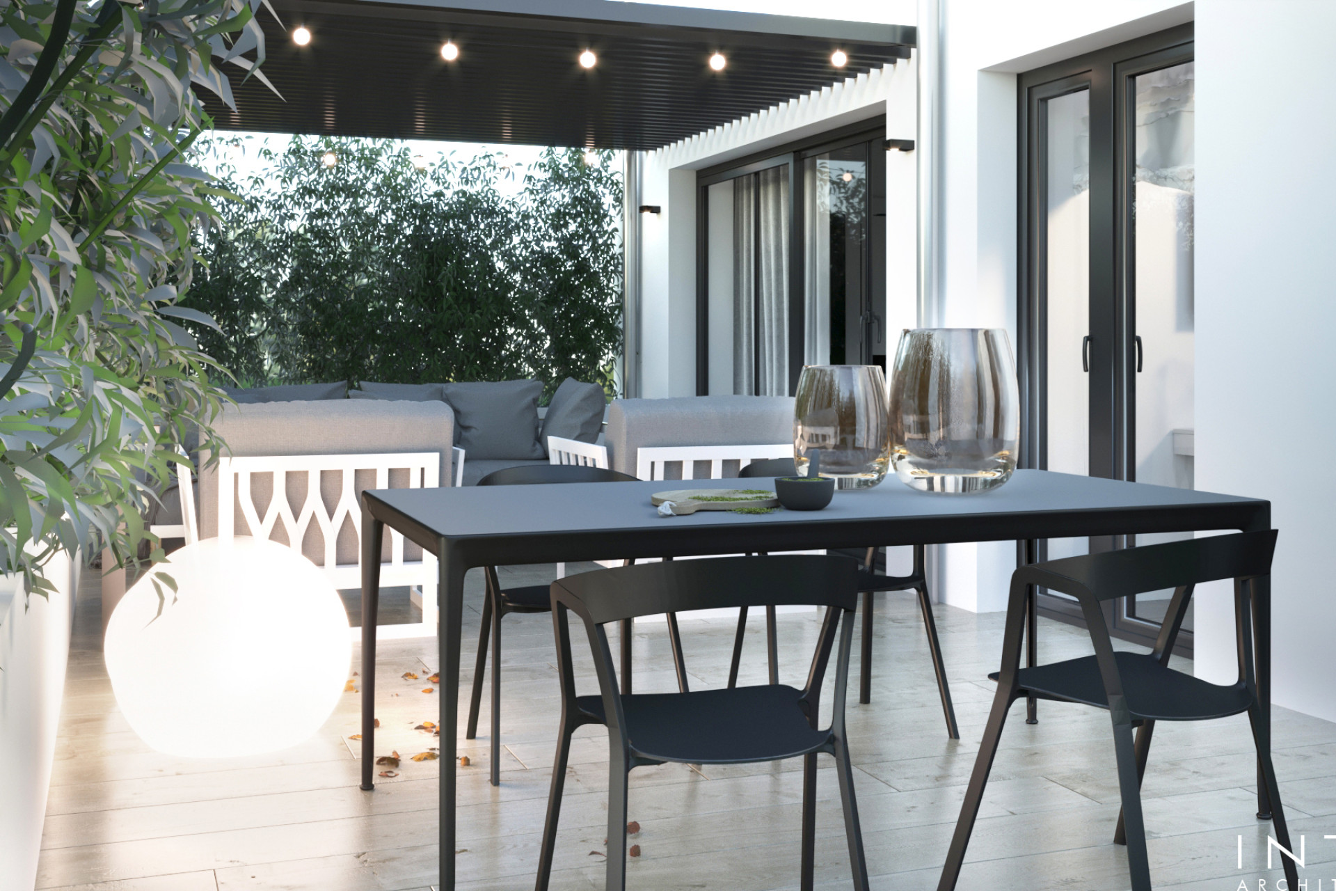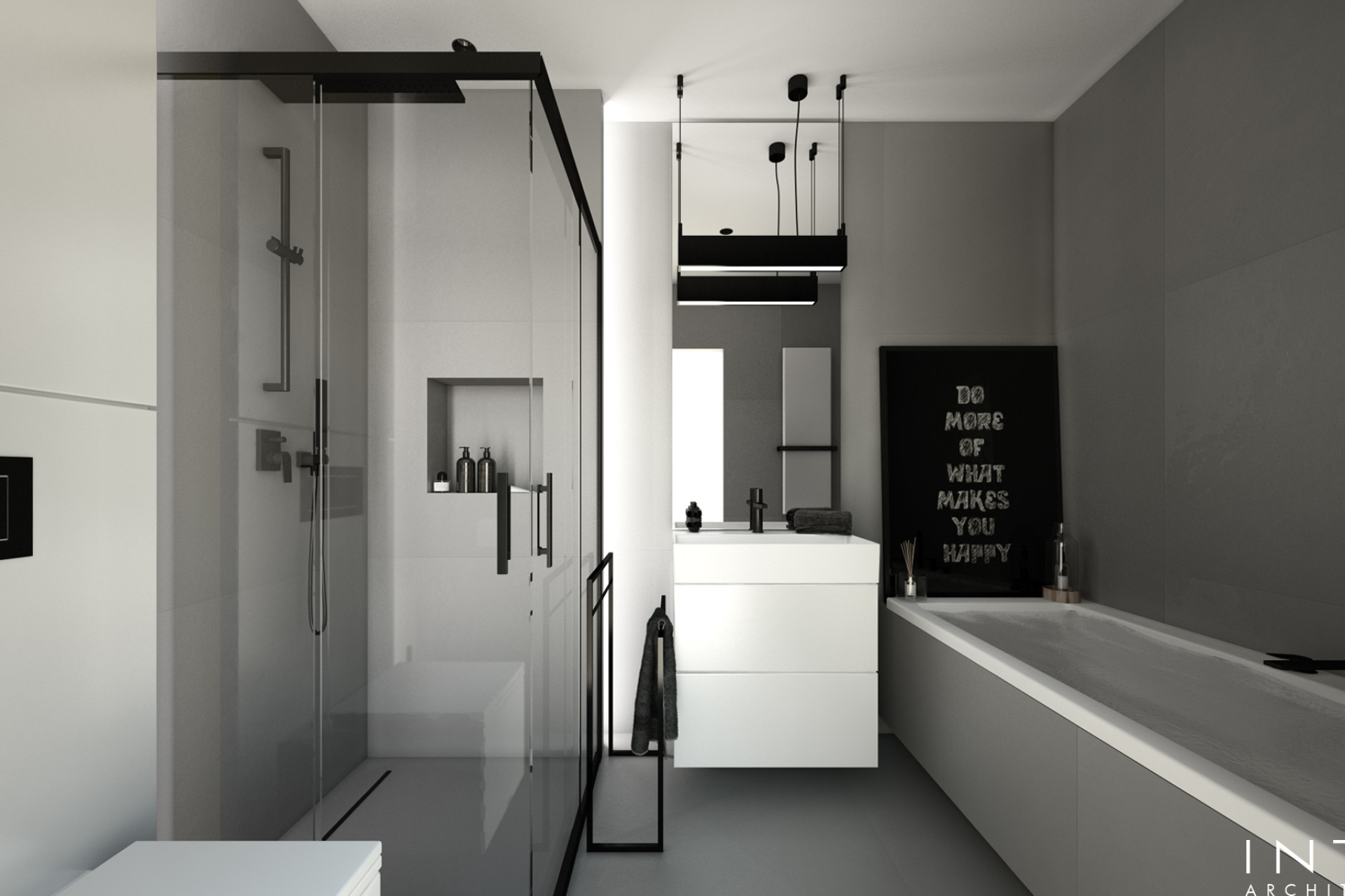 Wnętrze utrzymane jest w stonowanej palecie barw, bazującej na zestawieniu bieli, naturalnego drewna oraz czarnych detali. Geometryczne akcenty i konsekwentnie prowadzone linie zabudów podkreślają architektoniczny charakter projektu.