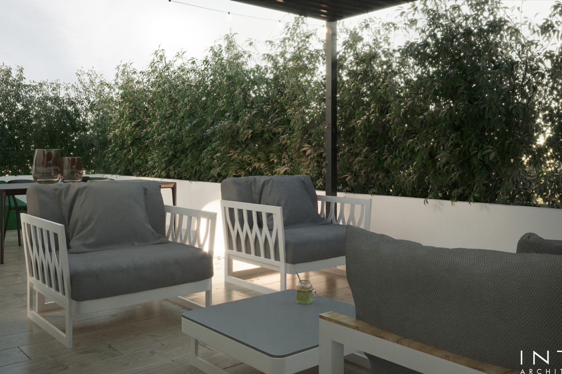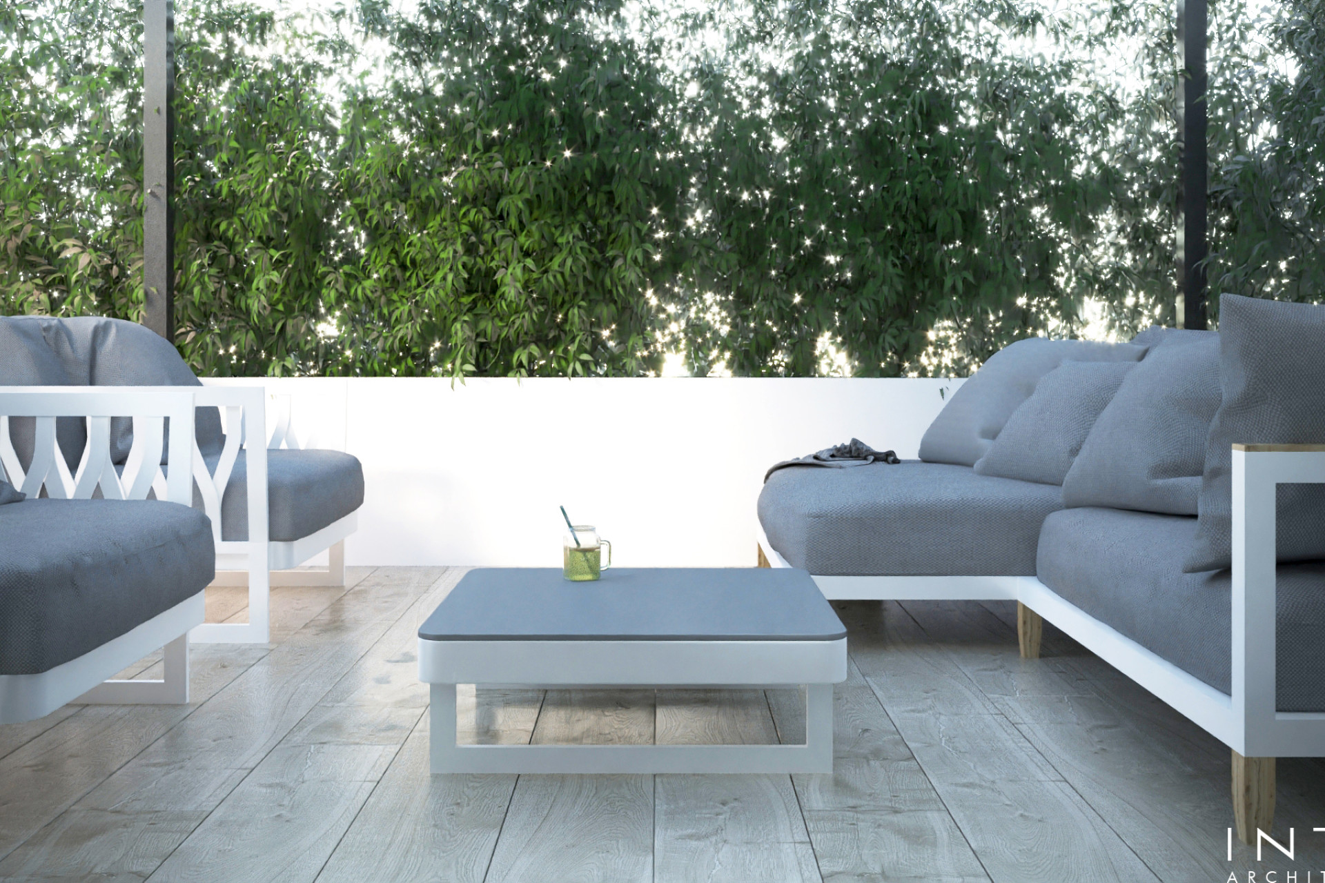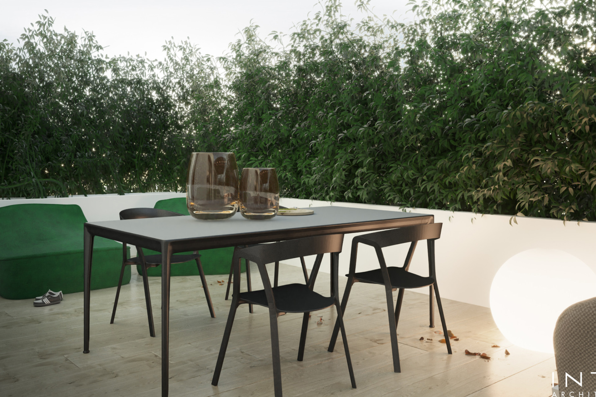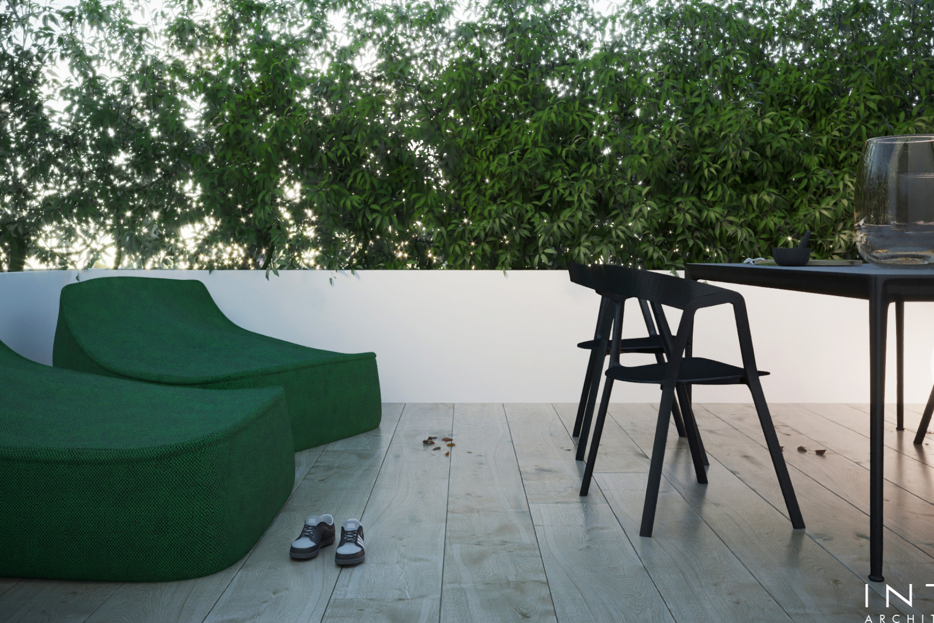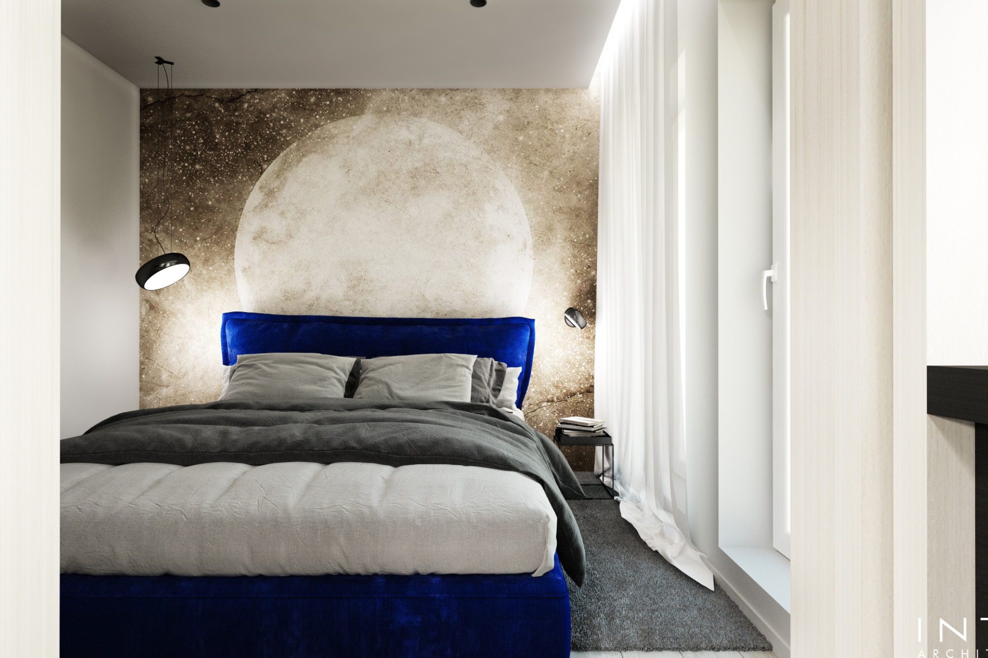 Istotnym elementem jest taras, który stanowi naturalne przedłużenie przestrzeni mieszkania. Sypialnia zaprojektowana z mocniejszym akcentem kolorystycznym i charakterystyczną tapetą.