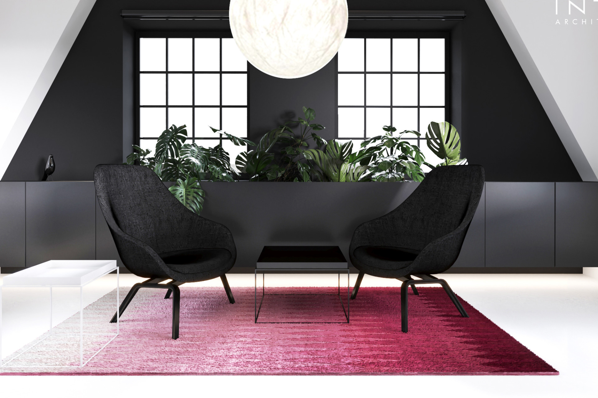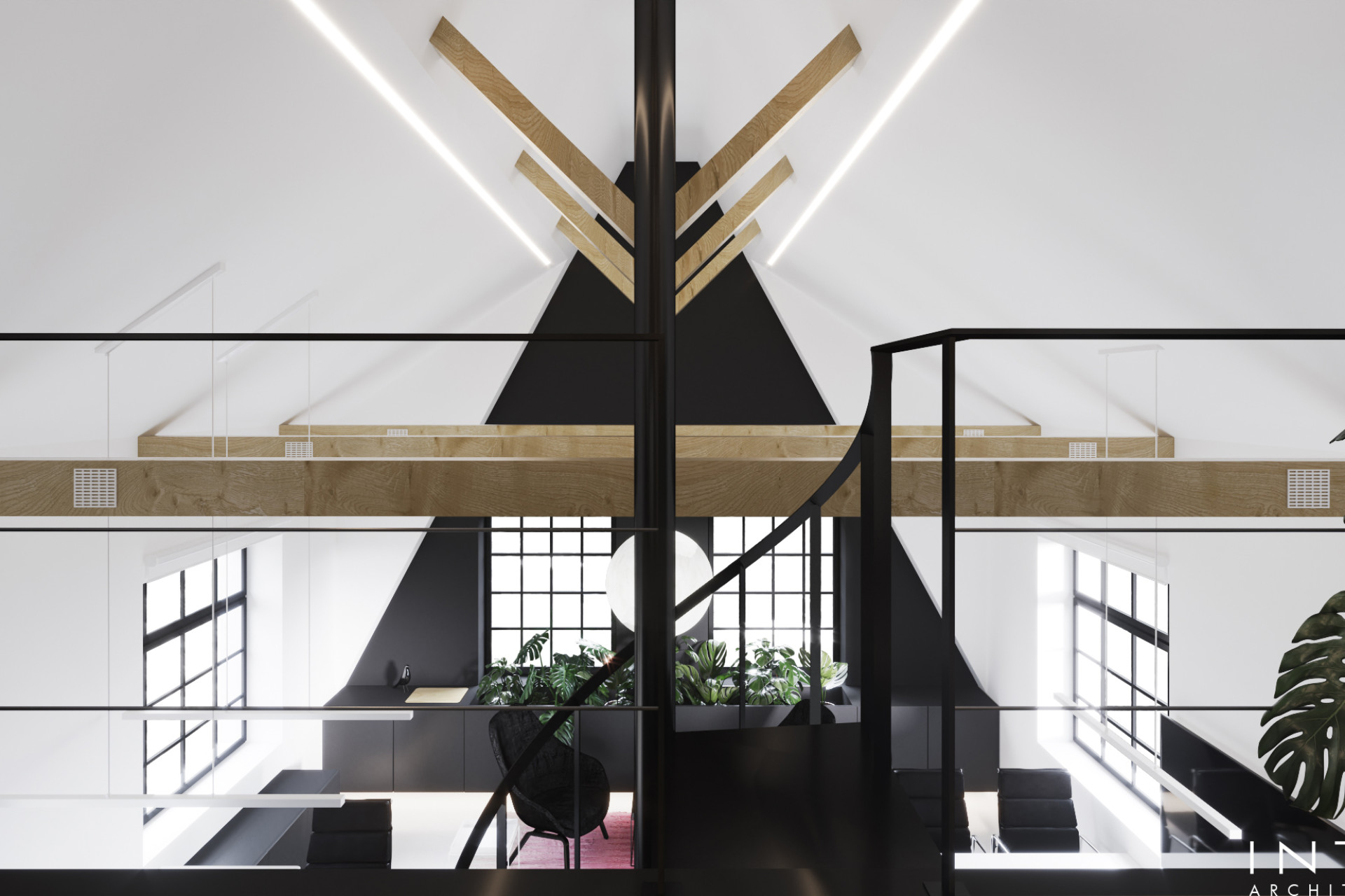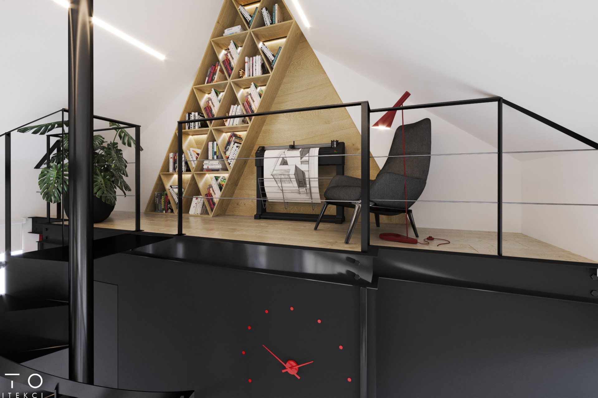 Antresola pełni rolę wydzielonej strefy skupienia, natomiast parter organizuje codzienną pracę w układzie open space. Minimalistyczna estetyka i precyzyjne detale budują profesjonalny wizerunek firmy.