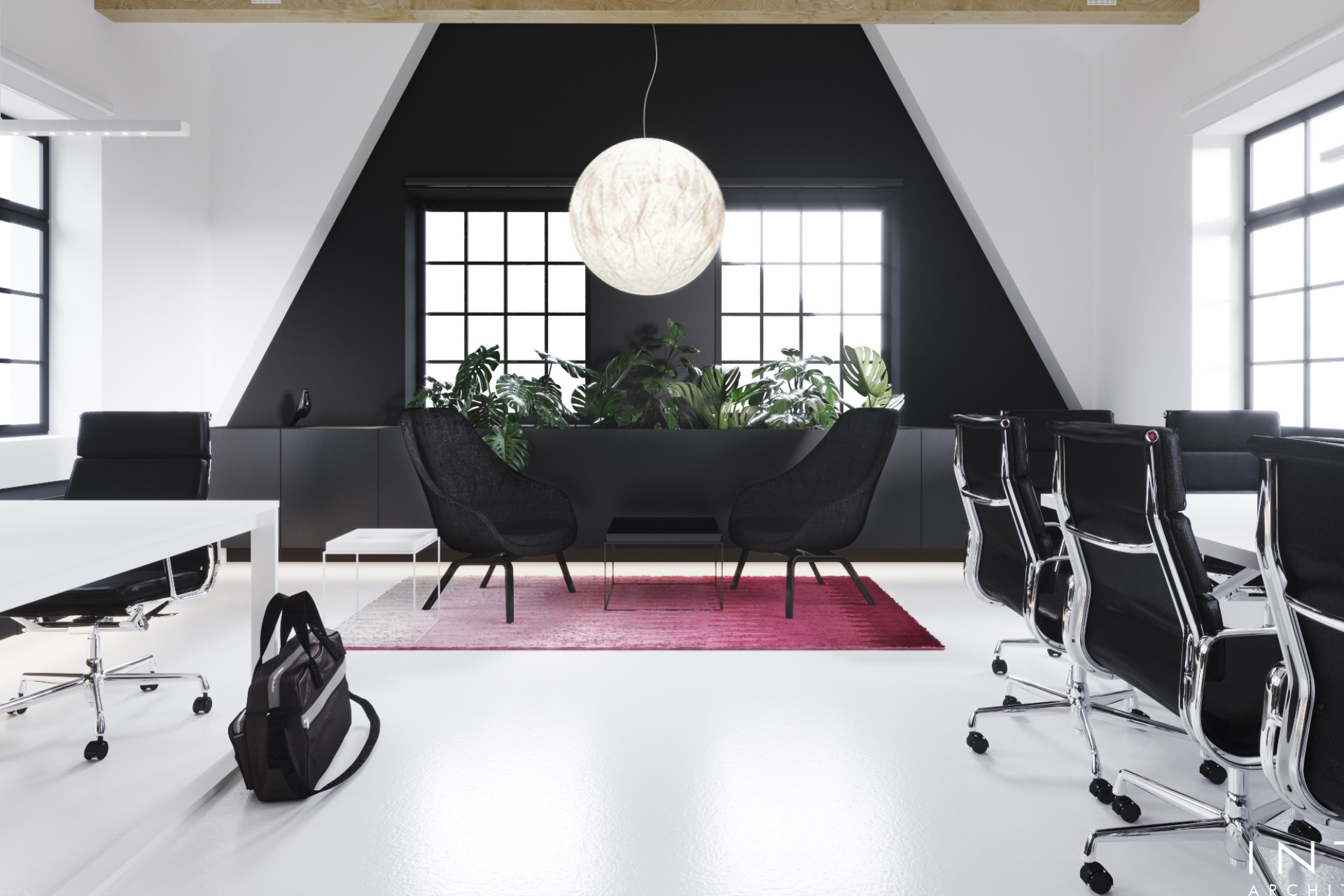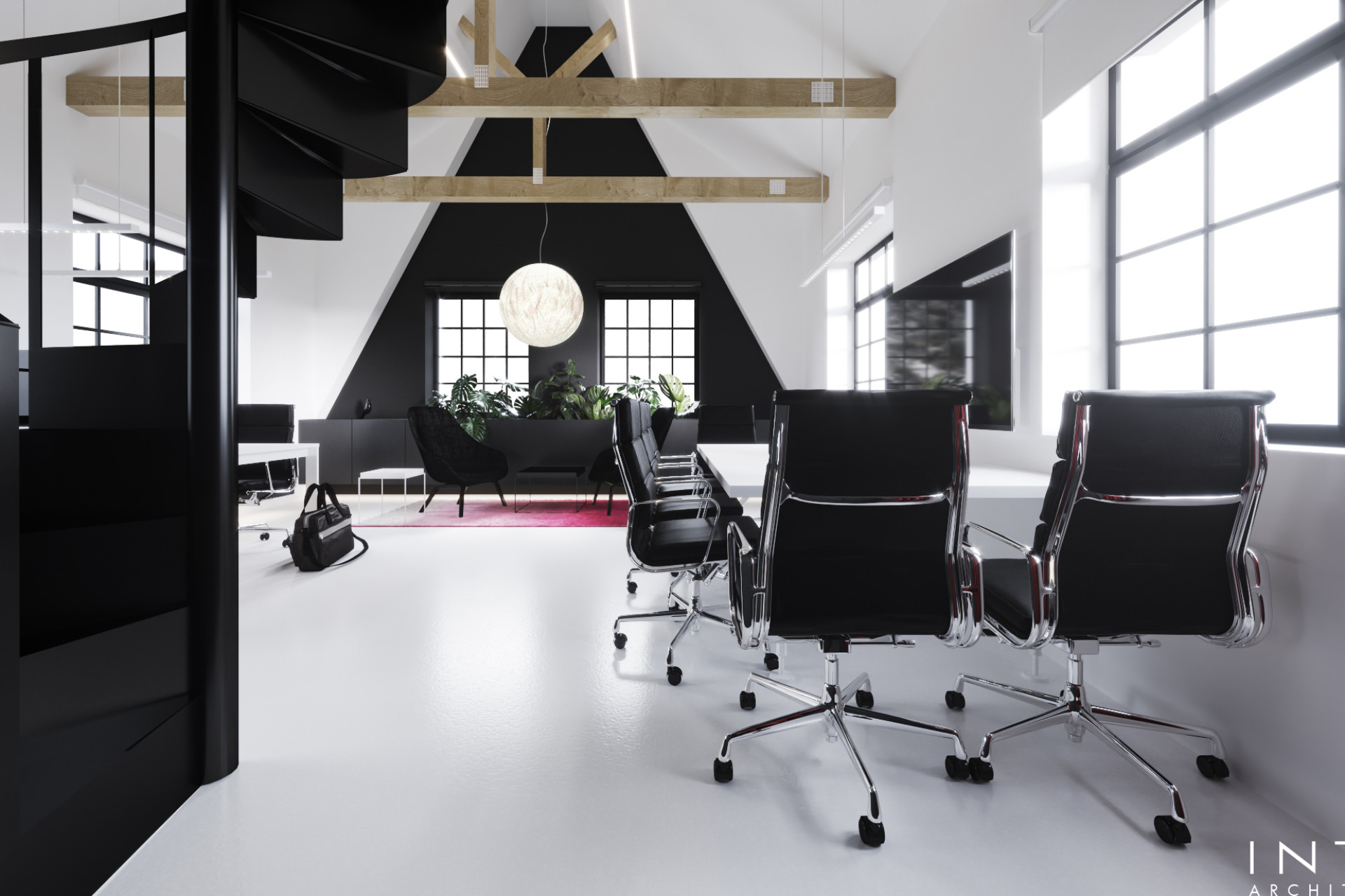 Projekt kameralnego biura o powierzchni 80 m² w Poznaniu z antresolą. Nowoczesna, minimalistyczna przestrzeń pracy łącząca strefę open space, antresolę i strefę spotkań w spójną, funkcjonalną całość.